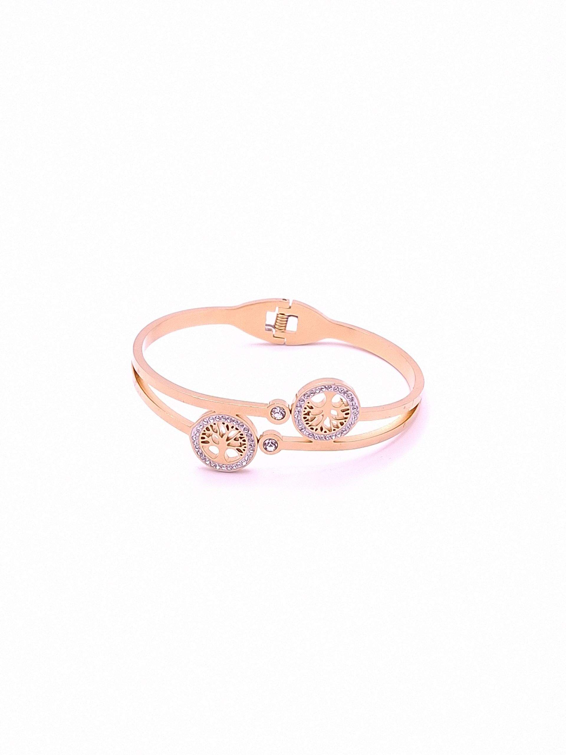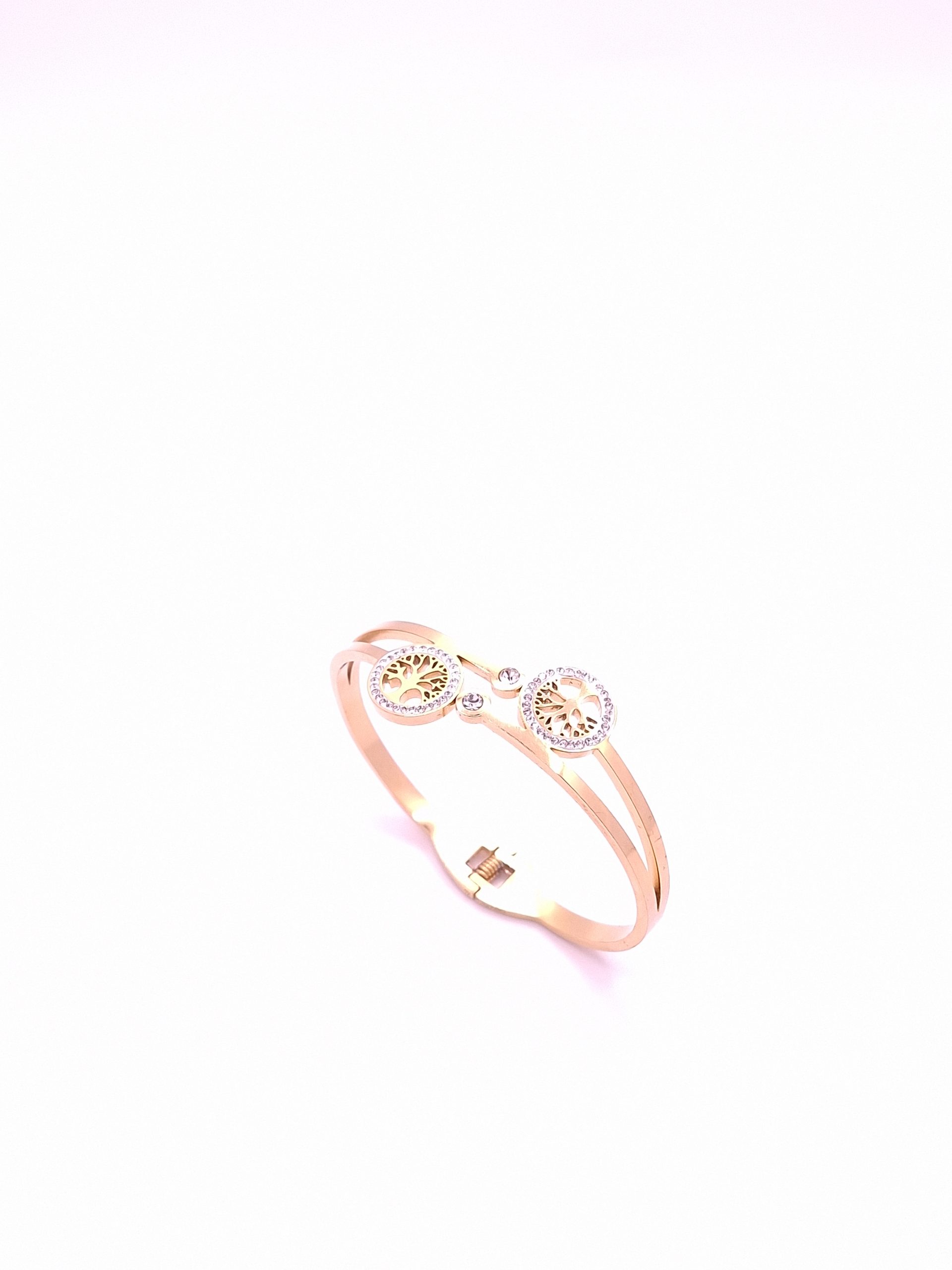 Eleganter Damenarmreif aus Titanstahl – 18K vergoldet mit Unendlichkeitsbaum, Nazar – blaues Auge & Drei-Stein