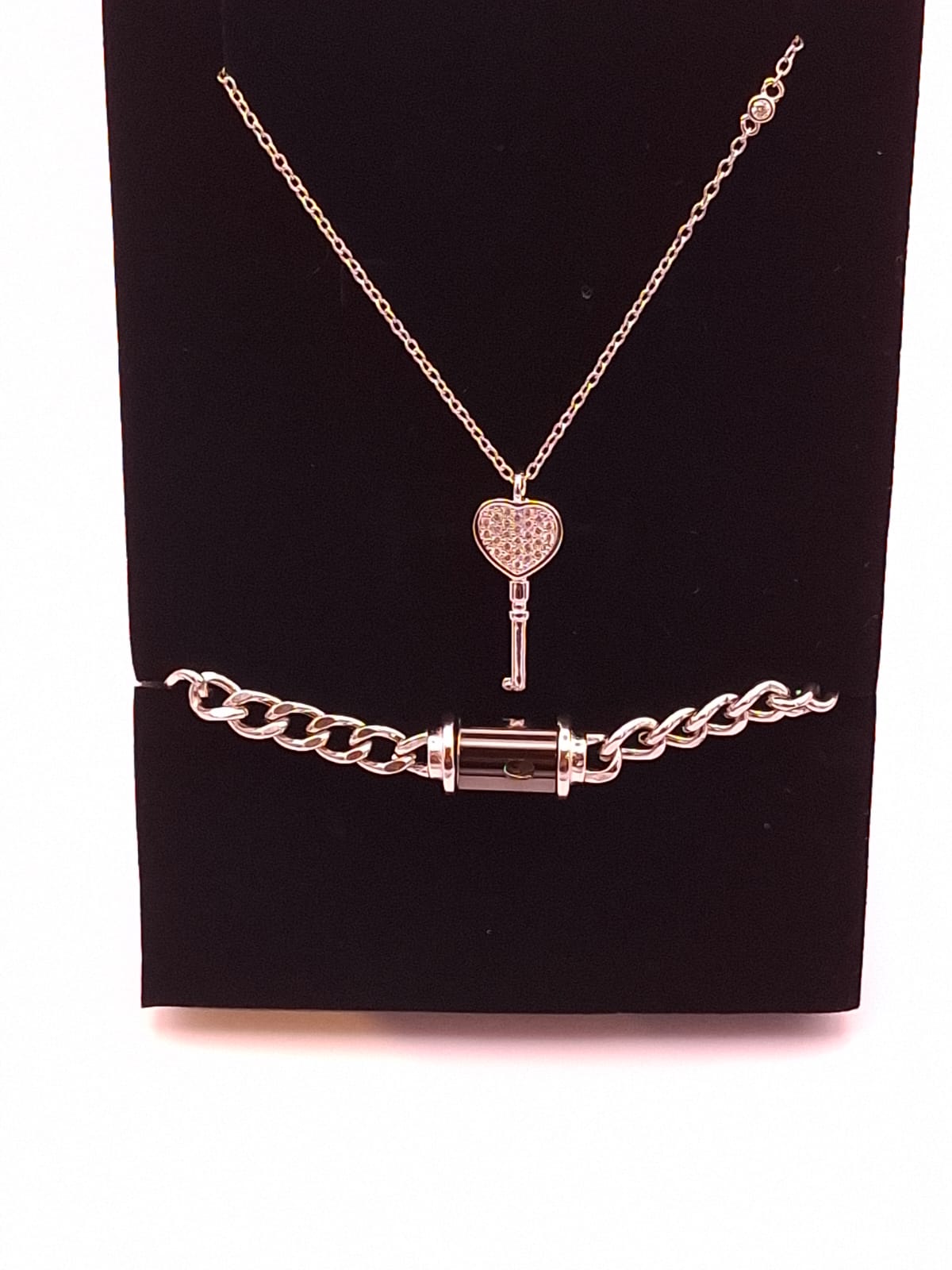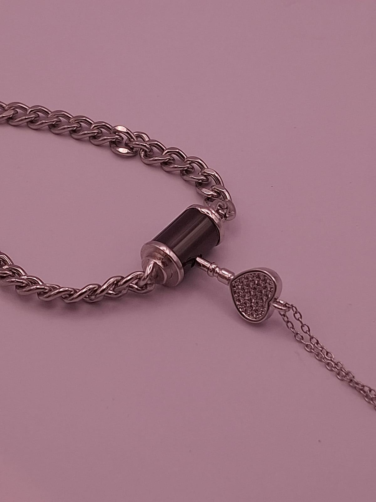 Das Herrenarmband ist mit einem raffinierten Verschlussmechanismus versehen, der nur mit dem Schlüsselanhänger der Damenkette geöffnet werden kann. Dieses exklusive Detail macht das Set zu einem romantischen Symbol: Nur die Trägerin besitzt den „Schlüssel“ zum Herzen ihres Partners.